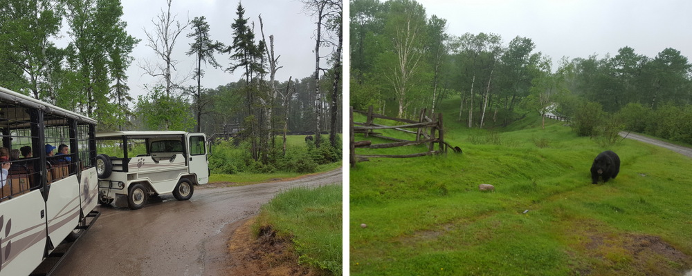Le lendemain, nous commençons la journée par la visite du zoo de Saint Félicien. Ce dernier ne possède que des espèces de la région boréale. Nous commençons par un petit documentaire interactif, de quoi vous donner quelques frissons. La visite se poursuit à bord d’un petit train grillagé traversant différentes plaines peuplées d’animaux dans leur habitat naturel. Après avoir aperçu notre premier ours noir, nous comprenons davantage l’intérêt des grillages !